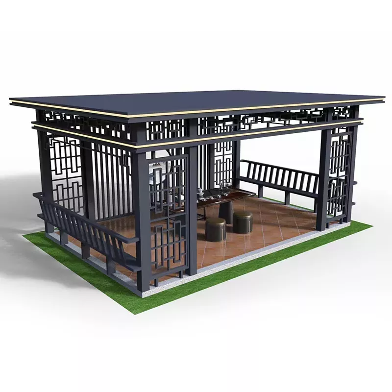पुरातन वास्तुकला पुनरुत्पादन मंडप (5000×5000mm): 120×120mm गाढा स्तम्भहरू, कोष्ठक संरचना, ओपनवर्क नक्काशी गरिएको ह्याङ्गिङ जालीहरू, सांस्कृतिक स्थलहरू र रमणीय स्थलहरूको मुख्य क्षेत्रहरूका लागि उपयुक्त।