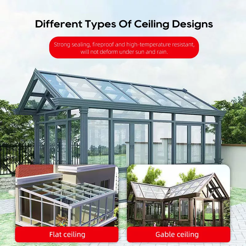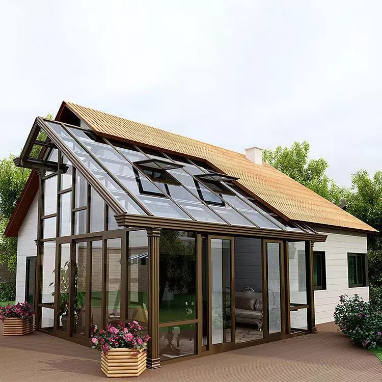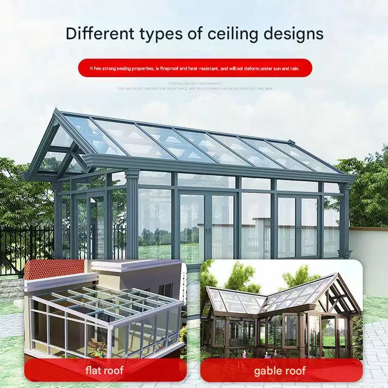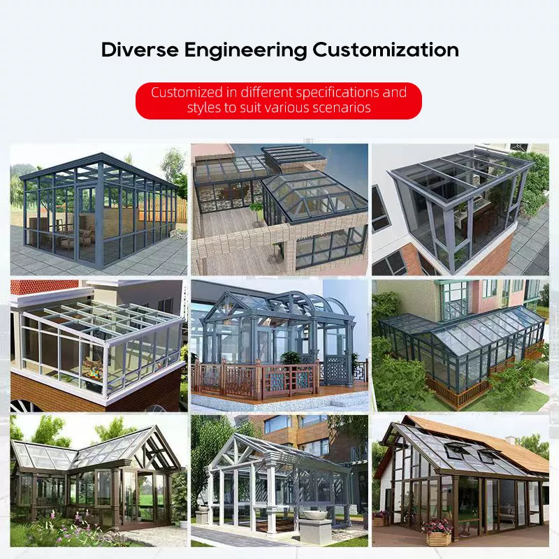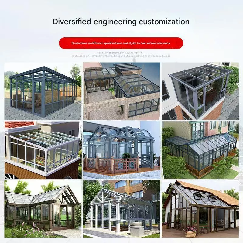 सनरूमले ए अपनाउँछ थर्मल ब्रेक एल्युमिनियम फ्रेम + इन्सुलेटेड टेम्पर्ड ग्लास संरचना। फ्रेममा स्तम्भहरू, बीमहरू, र विकर्ण समर्थनहरू हुन्छन्, जुन मोड्युलर प्रणाली मार्फत भेला हुन्छन्। सहित धेरै छत शैलीहरू समर्थन गर्दछ गेबल छत, समतल छाना, र घुमाउरो छाना।